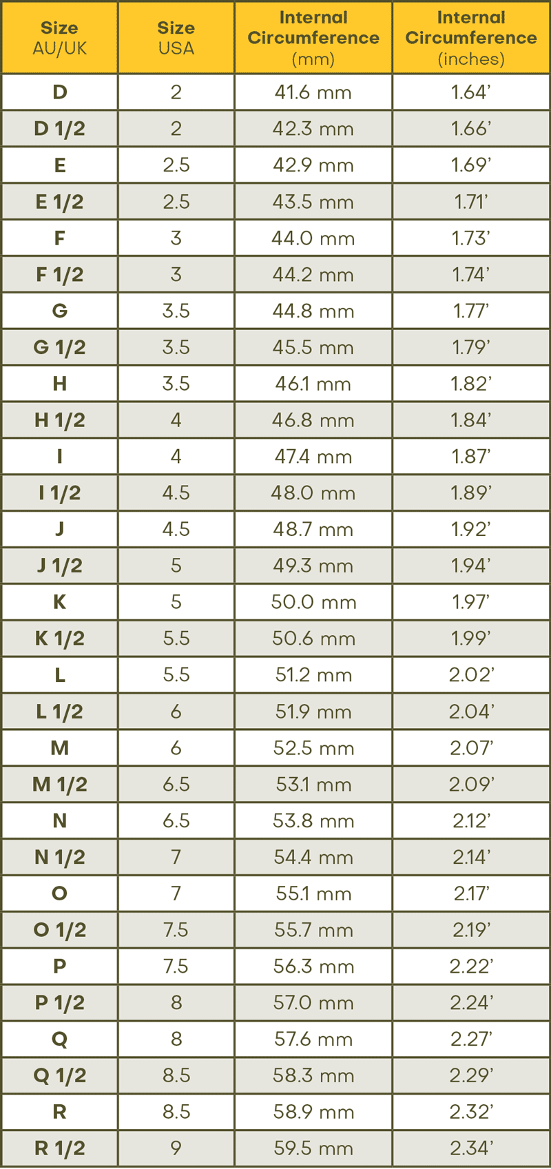 The most accurate way to find your size is with a professional ring sizer which you can determine when you visit us at one of our boutiques or otherwise your local jewellery store.
