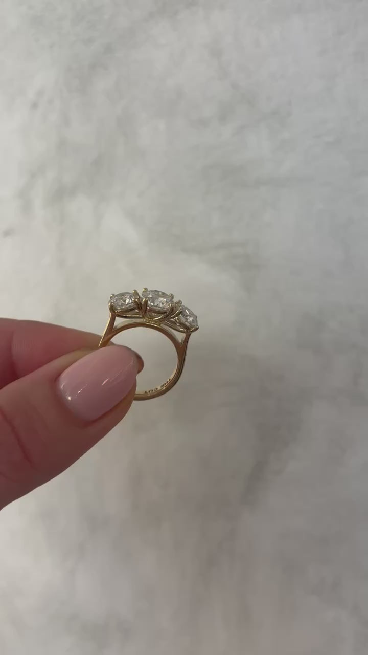 This highly sought-after design combines timeless romance with refined craftsmanship. The central diamond takes focus, flanked by two perfectly matched side stones that enhance its brilliance and depth.